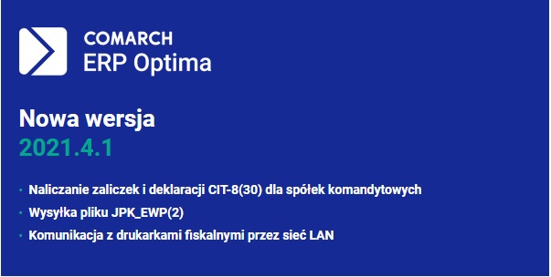 Nowa wersja oprogramowania Comarch ERP Optima to przede wszystkim zmiany związane z przepisami m.in. naliczanie zaliczek CIT-8(30) dla spółek komandytowych oraz wysyłka plików JPK_EWP(2). Dodano kilka nowych funkcjonalności m.in. możliwość komunikacji drukarek fiskalnych przez sieć LAN.