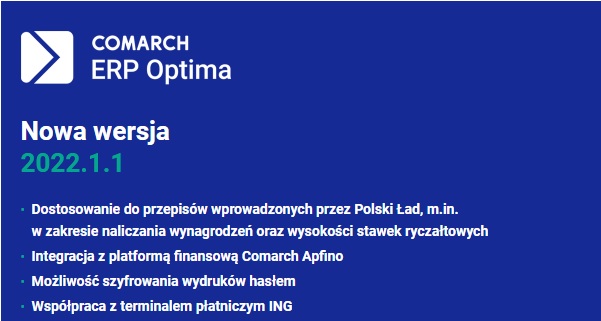 Nowa odsłona systemu Comarch ERP Optima to przede wszystkim zmiany w wyliczaniu wynagrodzeń wynikające z Polskiego Ładu. Umożliwiono wybór nowych stawek 12% i 14% w Ewidencji Ryczałtowej. Dodane zostały funkcję finansowania i windykacji faktur dzięki integracji Comarch ERP Optima z platformą finansową Comarch Apfino. Umożliwiliono szyfrowanie hasłem wydruków generowanych do plików PDF.