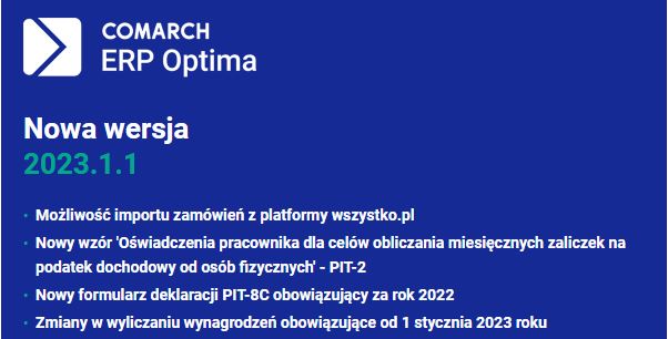 Nowa odsłona systemu Comarch ERP Optima to przede wszystkim możliwość naliczenia i wysyłki deklaracji CIT-8E(3) oraz PIT-37(29) na formularzach obowiązujących za rok 2022, a także możliwość wysyłki deklaracji CIT-8(32) do systemu e-Deklaracje. W nowej wersji wprowadzono również zmiany wynikające z nowelizacji kodeksu dotyczące pracy zdalnej.